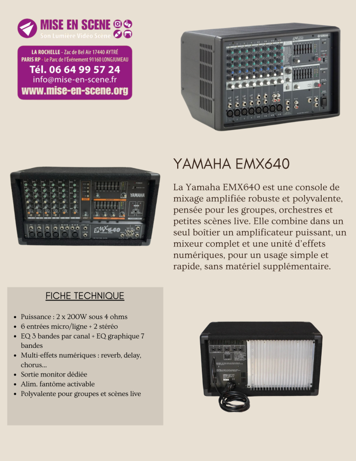 Les Yamaha EMX66 et EMX640 sont des consoles de mixage amplifiées conçues pour les musiciens, groupes et techniciens son recherchant une solution tout-en-un fiable et facile à utiliser. Elles regroupent dans un seul appareil un mixeur, un amplificateur de puissance et des effets intégrés, facilitant le transport, l’installation et l’exploitation, notamment pour les répétitions, petites scènes et prestations live.