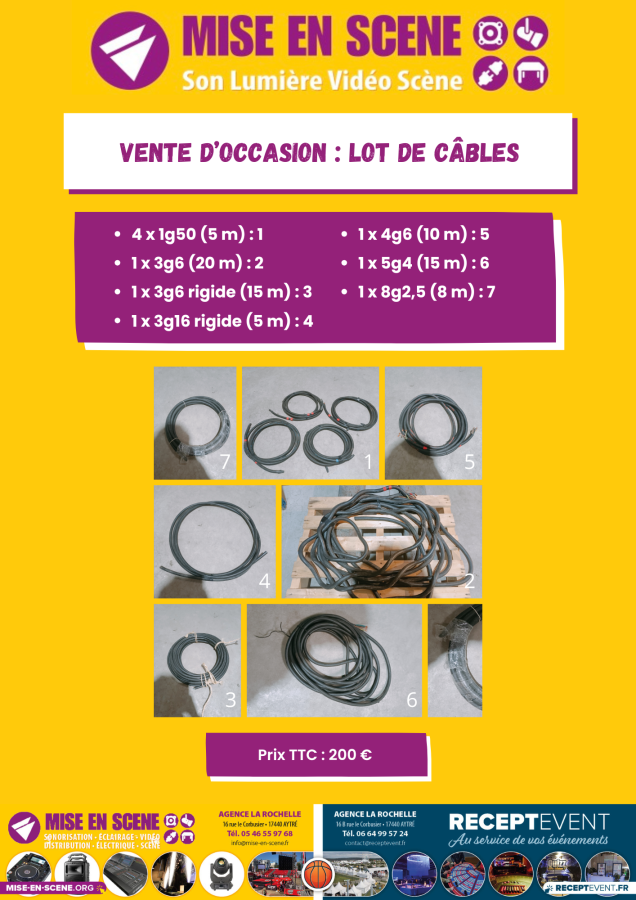 Mise en Scène propose à la vente un lot de câbles électriques professionnels. Différentes sections et longueurs sont disponibles. L’ensemble est en bon état et prêt à l’emploi.